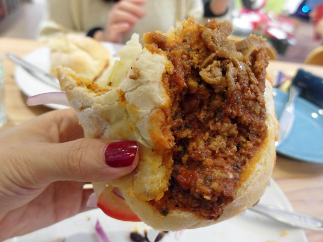 上層裡面塞滿辣肉醬和豚肉